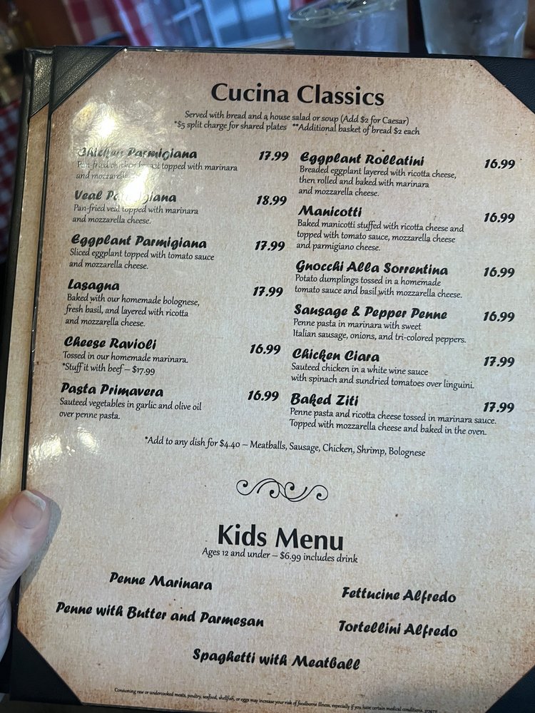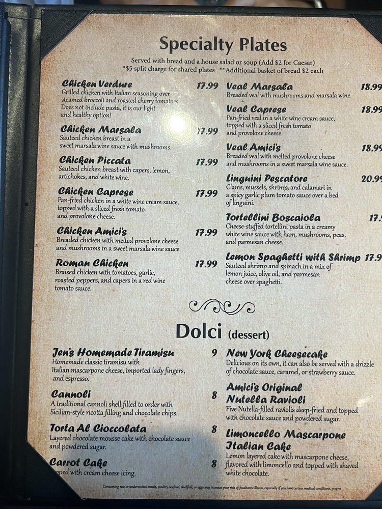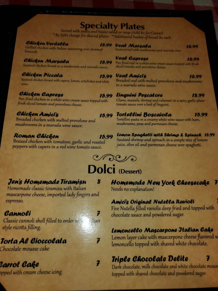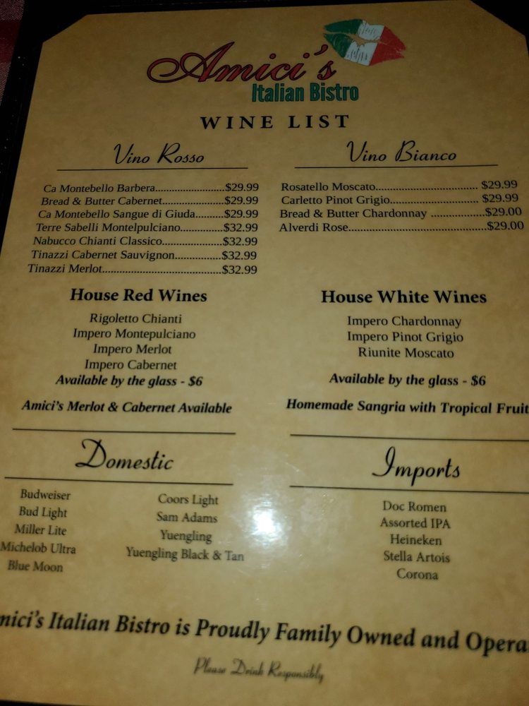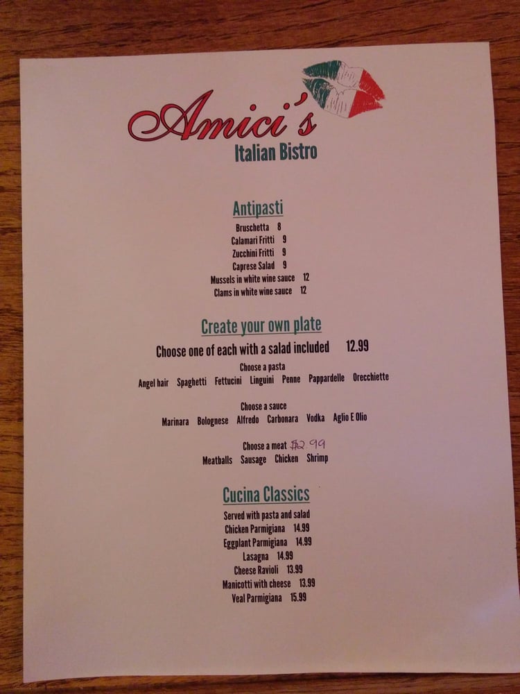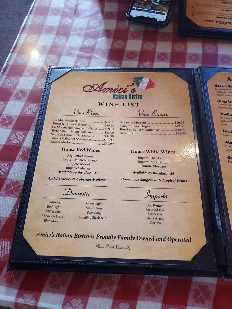 Introducing the menu at Amici's Italian Bistro, a cozy wine bar offering classic Italian dishes in North Charleston. Start your meal with appetizers like bruschetta, fried calamari, or meatball sliders. For the main course, indulge in Cucina Classics such as Chicken Parmigiana, Veal Parmigiana, or Eggplant Parmigiana. The menu also features delicious pasta dishes and flavorful lasagna. With a variety of options for vegetarians and a welcoming atmosphere, Amici's Italian Bistro is a top choice for a romantic dinner or a gathering with friends. The restaurant offers convenient amenities such as delivery, takeout, and catering services. Don't miss the chance to enjoy live music on Thursday nights while savoring authentic Italian flavors. Visit Amici's Italian Bistro at 7648 Northwoods Blvd and experience a taste of Italy in South Carolina.